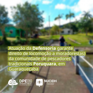 11:41 Atuação da Defensoria e do MPPR garante direito de locomoção a moradores(as) da comunidade de pescadores tradicionais Poruquara, em Guaraqueçaba Após diversas tratativas, a Defensoria Pública do Estado do Paraná (DPE-PR), em conjunto com o Ministério Público do Estado do Paraná (MPPR) e órgãos de proteção ambiental, conseguiu de forma extrajudicial que o município de Guaraqueçaba se comprometa a realizar as obras necessárias para assegura