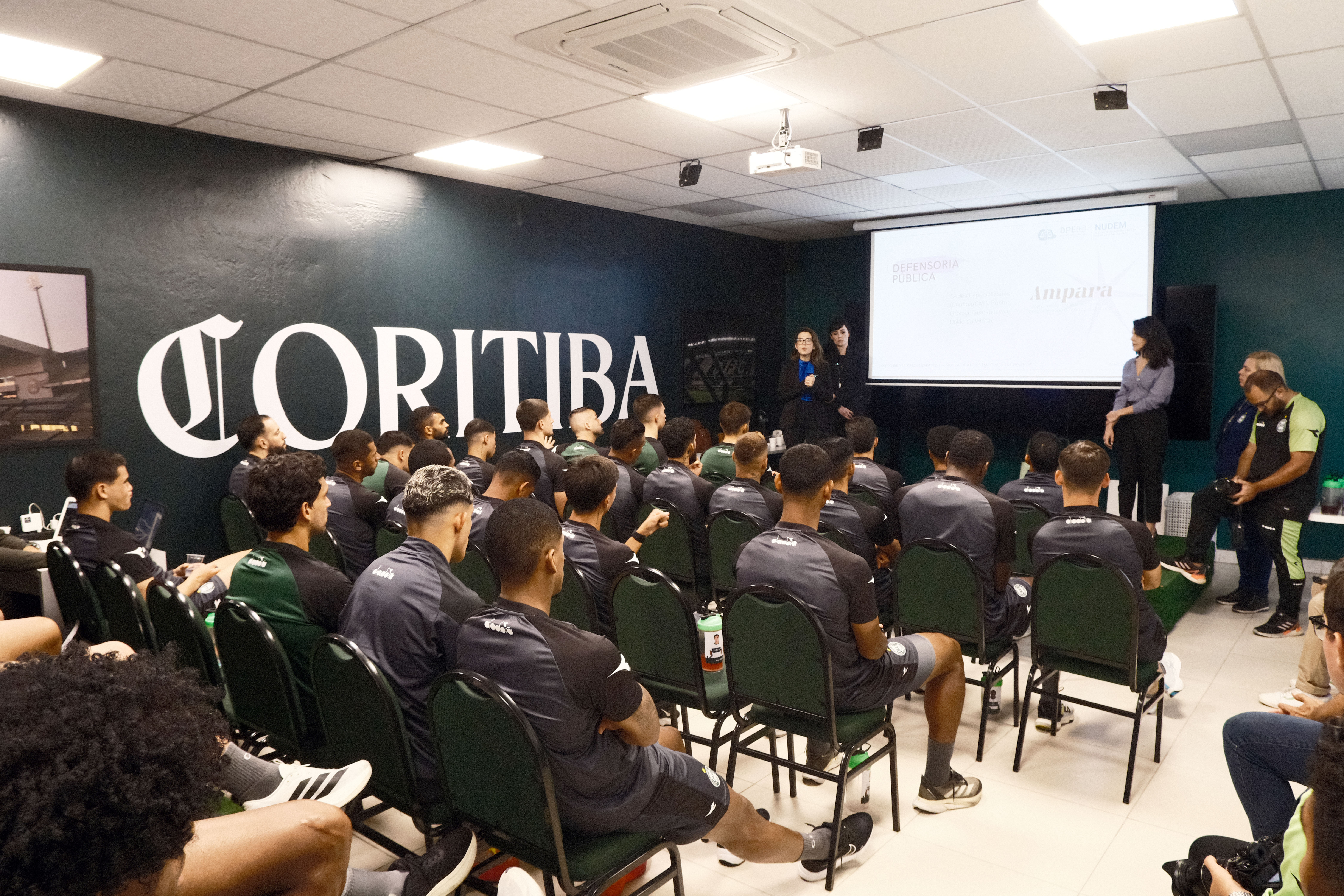 A Defensoria Pública do Estado do Paraná (DPE-PR) e o Coritiba Foot Ball Club, em mais uma parceria para educação em direitos, promoveram nesta semana duas palestras sobre violência contra as mulheres para atletas do time. A ação incluiu profissionais e jovens das categorias de base. O Núcleo de Promoção e Defesa dos Direitos das Mulheres (NUDEM), responsável por ministrar as palestras, debateu com os atletas o panorama e o enfrentamento à violência e ao feminicídio, desde as leis que protegem as mulheres, políticas públicas e, principalmente, a participação dos homens nesta discussão.