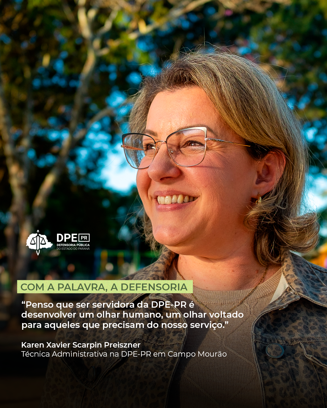Neste 28 de outubro, dia em que se comemora o Dia do Servidor Público, o projeto “Com a Palavra, a Defensoria” conversa com uma servidora que personifica a paixão pela instituição e pelo trabalho que realiza. Aos 45 anos, a técnica administrativa Karen Xavier Scarpin Preiszner tem uma trajetória marcada pela perseverança e por um profundo vínculo com Campo Mourão, sua cidade natal. Ela atua na comarca há quase uma década.