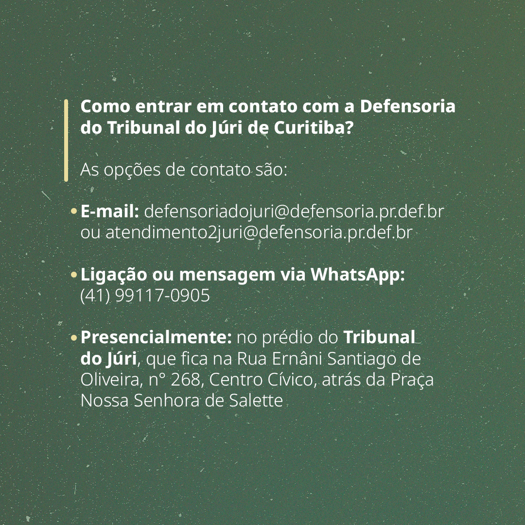 Quem estiver sendo processado(a) pela prática, em tese, de um crime contra a vida (na forma de uma tentativa ou crime já consumado), e não puder arcar com a contratação de um(a) advogado(a) particular, pode solicitar que a Defensoria Pública realize a sua defesa. Basta entrar em contato com a equipe da instituição nas Varas do Júri da capital pelos e-mails defensoriadojuri@defensoria.pr.def.br e atendimento2juri@defensoria.pr.def.br, ou ligando ou mandando mensagem para o número 41 99117-0905 ou comparecendo presencialmente à Rua Ernâni Santiago de Oliveira, n.° 268, Centro Cívico, atrás da Praça Nossa Senhora de Salete, no prédio do Tribunal do Júri da capital.