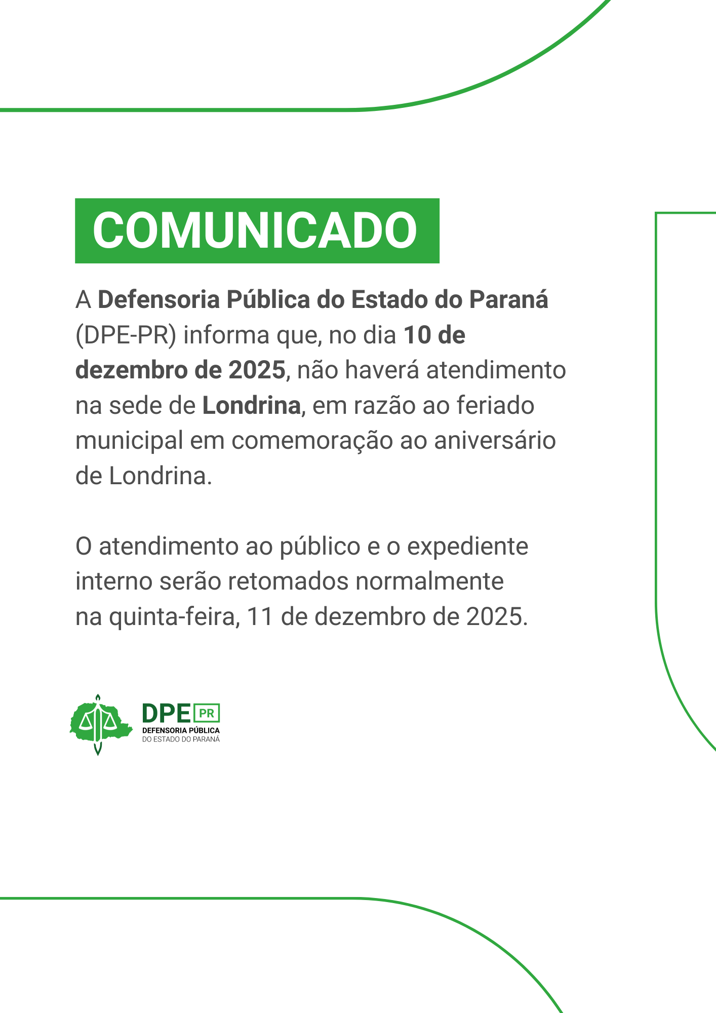 A Defensoria Pública do Estado do Paraná (DPE-PR) informa que, no dia 10 de dezembro de 2025, não haverá atendimento na sede de Londrina, em razão ao feriado municipal em comemoração ao aniversário de Londrina.