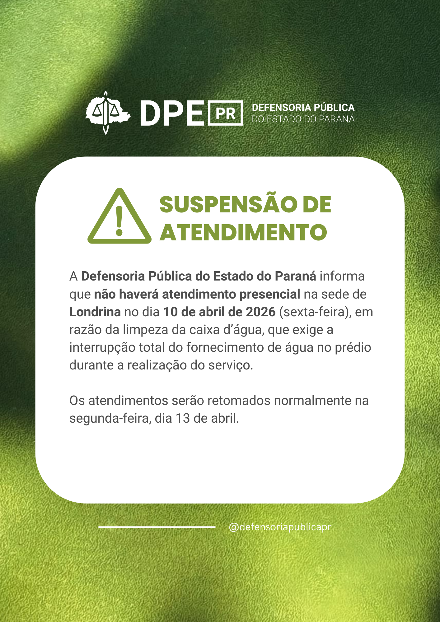 A Defensoria Pública do Estado do Paraná informa que não haverá atendimento presencial na sede de Londrina no dia 10 de abril de 2026 (sexta-feira), em razão da limpeza da caixa d’água, que exige a interrupção total do fornecimento de água no prédio durante a realização do serviço.