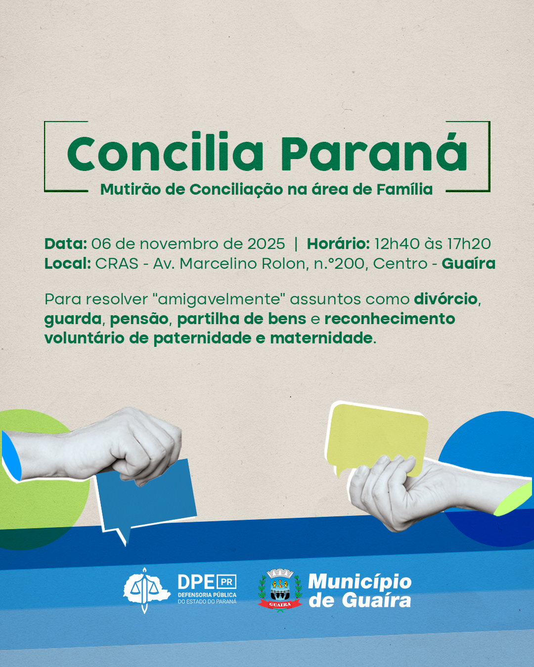 A Defensoria Pública do Estado do Paraná (DPE-PR) realizará, no próximo dia 06 de novembro, uma edição especial do mutirão "Concilia Paraná" na cidade de Guaíra. Pela primeira vez, o município, que não conta com uma sede da instituição, receberá a iniciativa que busca facilitar a resolução de conflitos na área de Família de forma gratuita e ágil. A ação tem o apoio da Prefeitura Municipal de Guaíra.