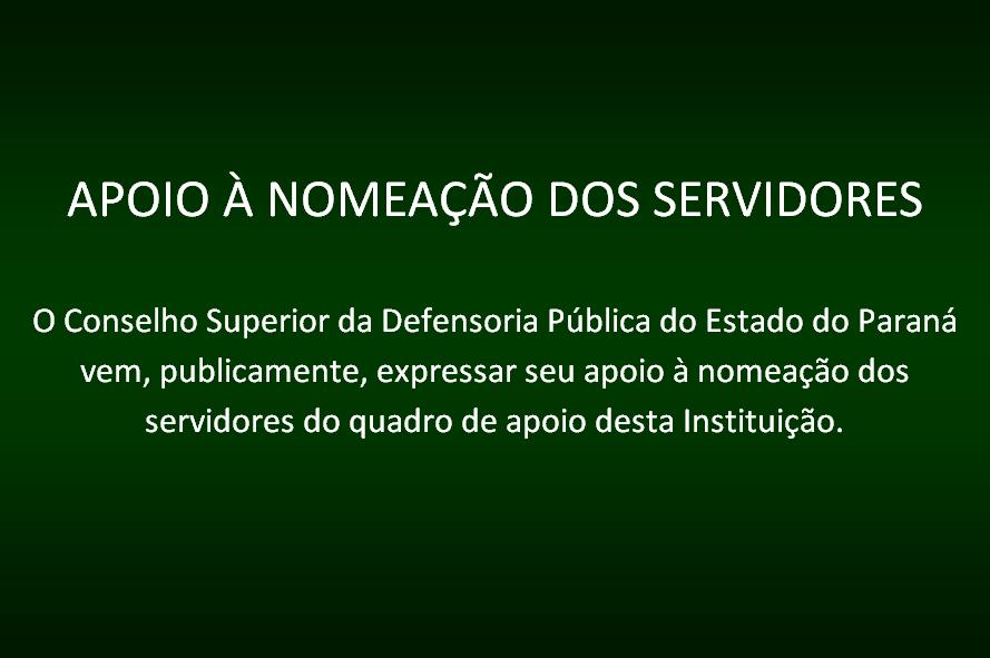 O Conselho Superior da Defensoria Pública do Estado do Paraná vem, publicamente, expressar seu apoio à nomeação dos servidores do quadro de apoio desta Instituição.