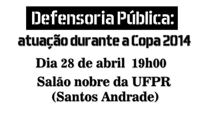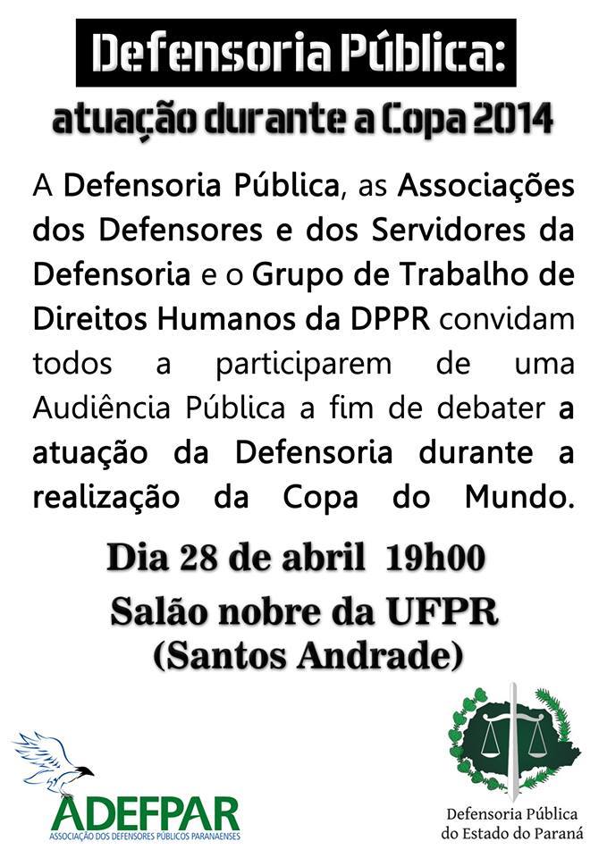 A Defensoria Pública do Estado do Paraná, a Associação dos Defensores Públicos Paranaenses (ADEFPAR), a Associação dos Funcionários da Defensoria Pública do Estado do Paraná (AFDP-PR) e o Grupo de Trabalho de Direitos Humanos da DPPR convidam todos a participarem da audiência pública que vai debater a atuação da Defensoria durante a realização da Copa do Mundo de 2014.