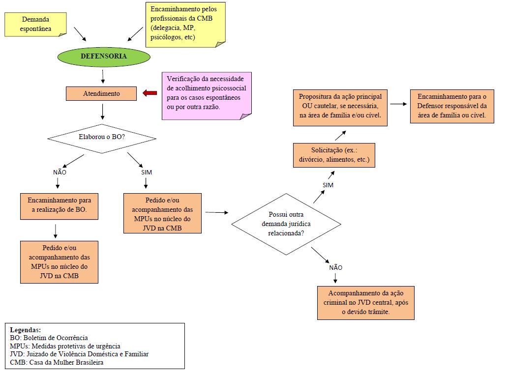 Defensoria pública e Lei Maria da Penha - De acordo com o artigo 27 da Lei Maria da Penha, a mulher em situação de violência doméstica deve ser acompanhada por um advogado ou defensor público. O artigo seguinte estabelece que o acesso à Defensoria Pública deve ser garantido e que o atendimento prestado deve ser humanizado.