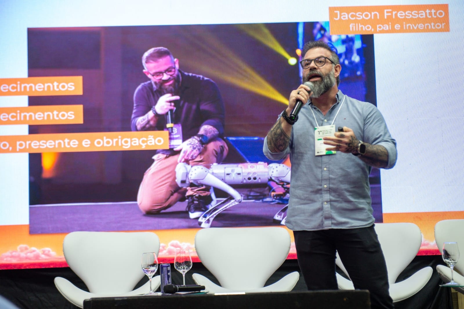 A palestra magna da noite trouxe uma reflexão sobre tecnologia aliada ao impacto social. O convidado foi Jacsson Fressatto, arquiteto de sistemas e criador do "Robô Laura", tecnologia brasileira que utiliza inteligência artificial para gestão de riscos à saúde. Fressatto, que figura entre os profissionais mais influentes da saúde no Brasil, abordou temas como inovação e propósito.
