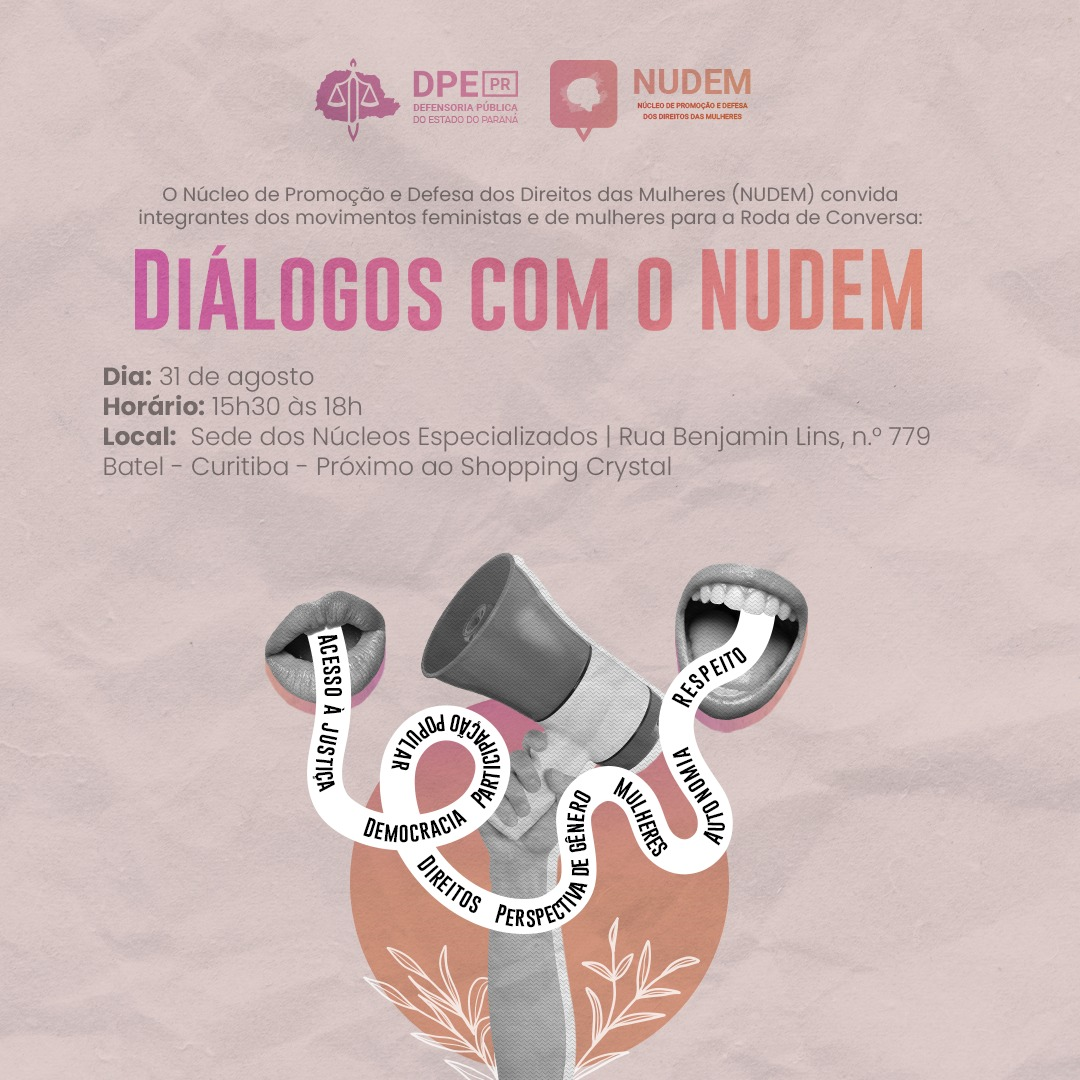 A Defensoria Pública do Estado do Paraná (DPE-PR), por meio do Núcleo de Promoção e Defesa dos Direitos das Mulheres (NUDEM), realiza no dia 31 de agosto, das 15h30 às 18h, o evento “Diálogos com o NUDEM”, que irá promover discussões e coletar novas demandas da população para o Núcleo.