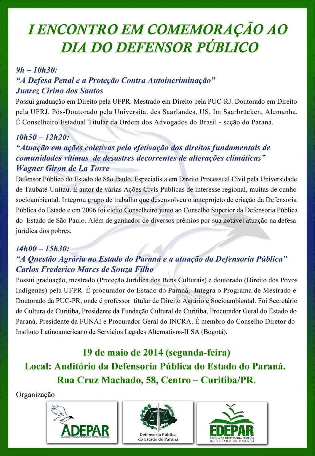 A primeira palestra começa às 9h com o advogado Juarez Cirino dos Santos, que vai falar sobre "A defesa penal e a proteção contra autoincriminação". Ainda no período da manhã, o defensor público de São Paulo Wagner Giron de La Torre vai tratar do tema "Atuação em ações coletivas pela efetivação dos direitos fundamentais de comunidades vítimas de desastres decorrentes de alterações climáticas”. À tarde, a partir das 14h, acontece a palestra "A questão agrária no estado do Paraná e a atuação da Defensoria Pública", com a presença de Carlos Frederico Mares de Souza Filho, procurador do Estado do Paraná e membro do Conselho Diretor do Instituto Latinoamericano de Servicios Legales Alternativos (ILSA), de Bogotá.